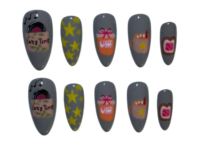 Cozy Time is all about life’s little pleasures—vinyl melodies filling the room, hot chocolate warming your hands, and sweet berry jam spread across fresh bread. Each nail is a dreamy vignette, sprinkled with twinkling stars to capture that magical, wrapped-up-in-coziness feeling. It’s nostalgia, sweetness, and comfort—right at your fingertips.